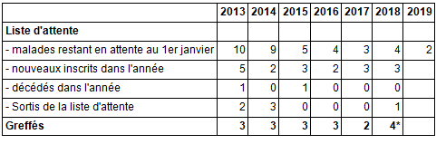 Au 1er janvier 2019, 2 patients étaient en attente d’une greffe intestinale (contre 10 en 2013 et 21 en 2010) et 3 nouveaux patients ont été inscrits dans l’année (contre 5 à 7 entre 2013 et 2010).  Seulement 4 malades ont été greffés en 2018, soit une activité stable depuis 2013 et un malade est sorti de liste.